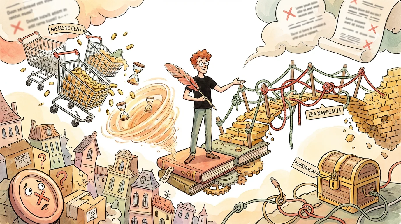 Błędy na stronie produktu to potknięcia w treści, układzie, technologii albo procesie zakupu, które utrudniają ocenę oferty i dorzucenie produktu do koszyka. I nie, to nie tylko rzeczy dosłownie „zepsute”, jak martwy przycisk. Problem w tym, że częściej bolą elementy teoretycznie poprawne, lecz nieczytelne, niepełne albo źle ustawione w hierarchii. Czytelnik niby wszystko ma, ale i tak musi się domyślać.