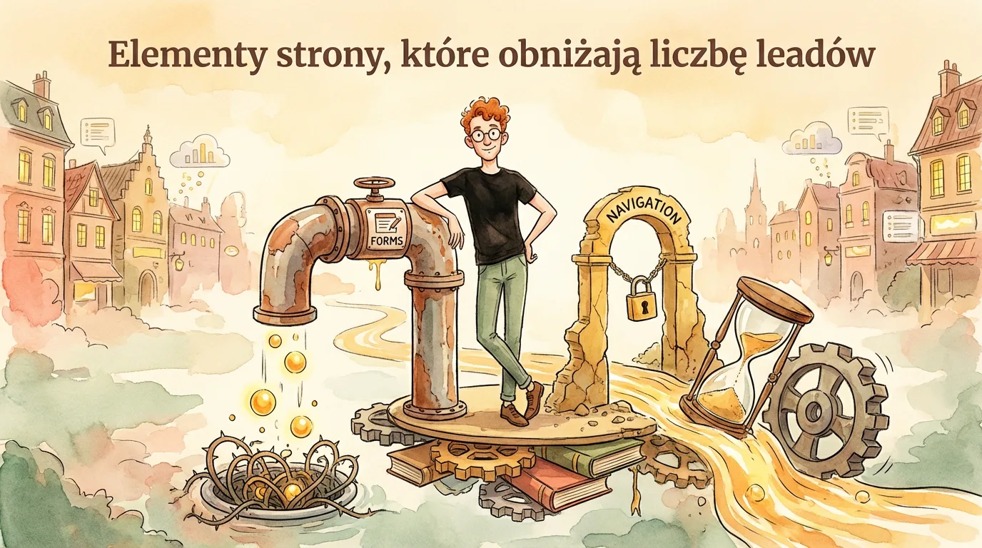 Elementy strony obniżające liczbę leadów to konkretne części serwisu i procesu konwersji, które dokładają użytkownikowi oporu przed wykonaniem akcji. Brzmi technicznie, ale działa bardzo przyziemnie. To może być niejasny nagłówek, słaba propozycja wartości, niewidoczne CTA, zbyt długi formularz, brak danych kontaktowych, brak dowodów zaufania albo problemy techniczne. Każdy z tych punktów podcina jeden z trzech warunków skutecznego pozyskania leada: zrozumienie oferty, zaufanie do firmy i łatwe wykonanie akcji.