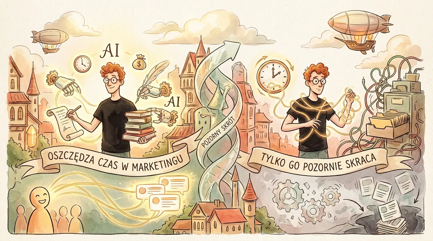 AI w marketingu potrafi skrócić pracę o godziny. Ale równie łatwo dokłada czas na poprawki, weryfikację i gaszenie drobnych, irytujących błędów. W praktyce problem nie polega na tym, czy narzędzie umie coś wygenerować, tylko czy ten wynik da się szybko i bezpiecznie wpiąć w realny proces. Dlatego lepiej patrzeć nie na pojedynczy prompt, lecz na cały przepływ pracy: od danych wejściowych, przez szkic, po akceptację i publikację. Najważniejsze jest nie to, jak szybko AI coś napisze, ale ile czasu zespół potrzebuje, by dowieźć poprawny efekt końcowy. Ten artykuł pokazuje, gdzie AI faktycznie odciąża marketing, a gdzie tworzy tylko złudzenie przyspieszenia. Chodzi o decyzje praktyczne: co automatyzować, co jedynie wspierać AI, a co zostawić człowiekowi.