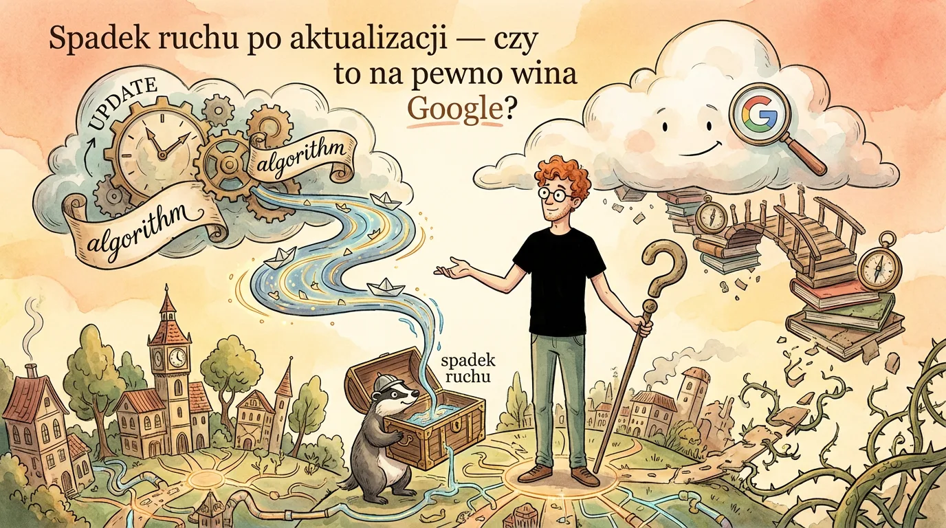 Spadek ruchu po aktualizacji to diagnoza, nie wyrok od Google. Sama zbieżność dat potrafi zwieść, bo w tym samym czasie mogły wejść zmiany w serwisie, analityce albo nawet w układzie wyników wyszukiwania. Największy grzech. Patrzenie na jeden wykres dla całej domeny i wyciąganie z niego „prawdy objawionej”. Najpierw trzeba ustalić, czy naprawdę spadło SEO, czy tylko pomiar, indeksacja, CTR albo popyt na zapytania. Dobra diagnoza bez litości pokazuje, które segmenty ucierpiały, od kiedy, na jakich URL-ach i z jakiego powodu. Dopiero wtedy da się sensownie zdecydować, co naprawiać, co monitorować i czego nie ruszać bez twardych dowodów.